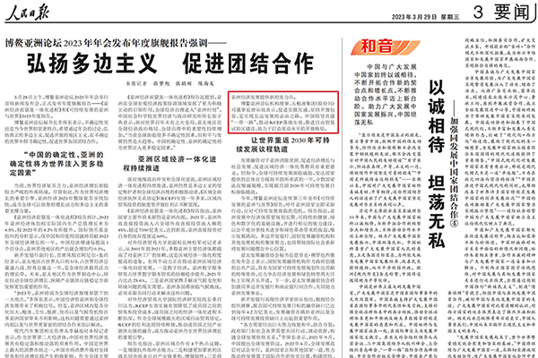 3月29日,人民日报“要闻”版刊发题为《博鳌亚洲论坛2023年年会发布年度旗舰报告强调——弘扬多边主义 促进团结合作》的评述文章。
